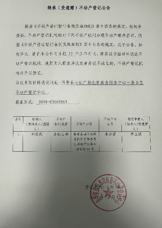 标题:继承(受遗赠)不动产登记公告(林道侠)
